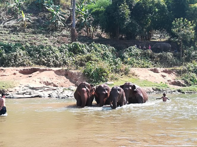 Iniciamos la marcha rumbo al Elephant Nature Park, aproximadamente a una hora en coche desde la ciudad, que es un santuario para elefantes que han sido maltratados o sometidos a una vida que no deberían llevar. Al llegar allí, nos reciben aleteando sus orejas en señal de alegría. Hemos podido disfrutar de darles de comer, verlos pasear y bañarse en el agua y en el barro e incluso nos han permitido acercarnos a hacerles unas caricias.