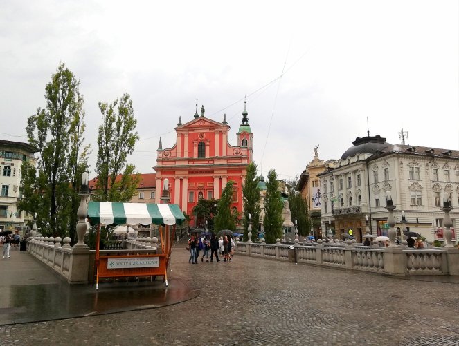 Mi ruta por la cuidad empieza en la plaza Presernov, muy bonita y particular gracias a la pincelada colorista que pone el tono rojo de la Iglesia de la Asunción.