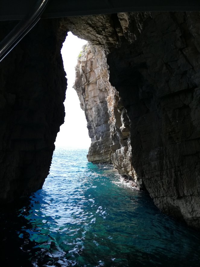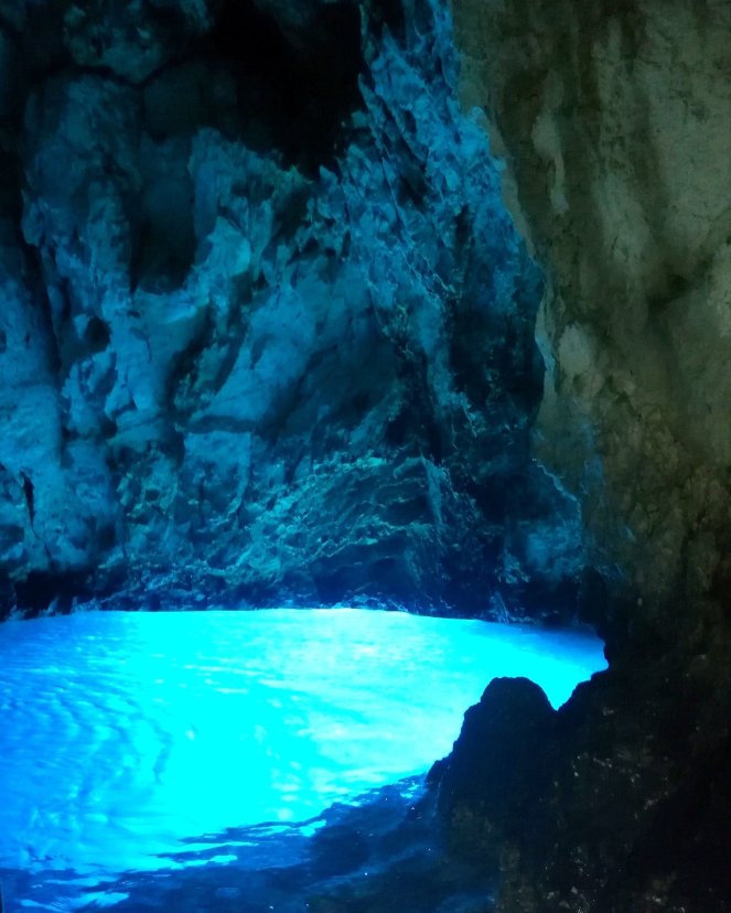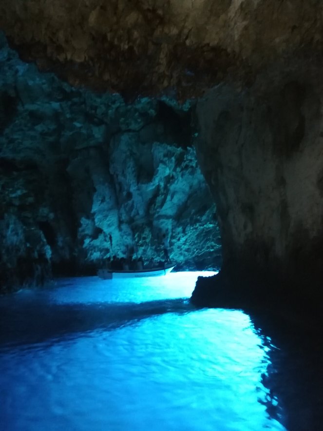 El tour ha empezado muy pronto por la mañana para llegar lo antes posible, después de hora y media de camino en la lancha, a la isla de Bisevo, donde se encuentra la Gruta Azul. Las olas del mar han erosionado la piedra volcánica de la que están compuestas las islas creando una cueva con muy poco acceso al exterior salvo por un agujero por debajo del nivel del mar que permite el paso de la luz natural dejando así este espectáculo natural.