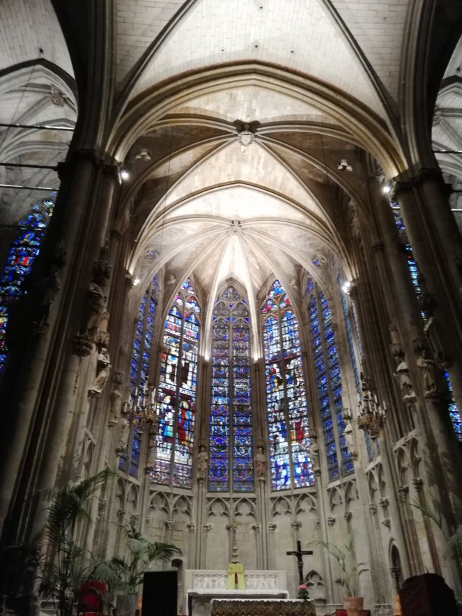 Por suerte, ya que estaban a punto de cerrar, he podido entrar a echar un vistazo y me han dejado estar allí a solas durante unos minutos. El altar repleto de preciosas vidrieras me ha dejado absorta durante un rato y, cuando me he recuperado, he vuelto a extasiarme con el rosetón.