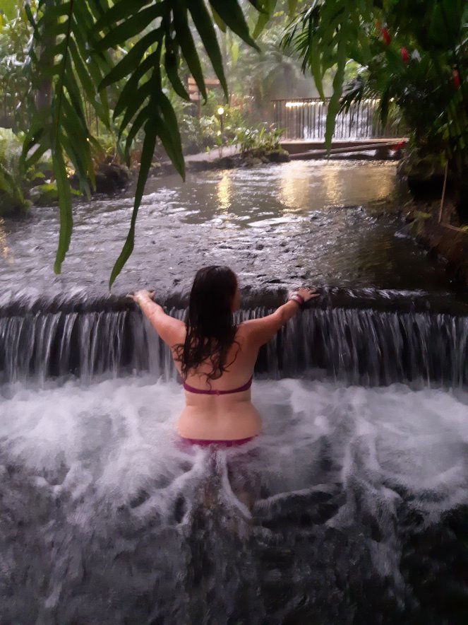 Rematamos este día pasado por agua con un poco más gracias al circuito de aguas termales del Tabacón. Las aguas de este lugar proceden directamente del volcán y por ello salen ardiendo. Es un lugar para relajarse y dejarse impregnar por los beneficios para la salud y la piel de este agua, pero es que además el sitio es una auténtica belleza. Hemos pasado un rato de sensaciones a flor de piel y hemos salido renovadas de allí.